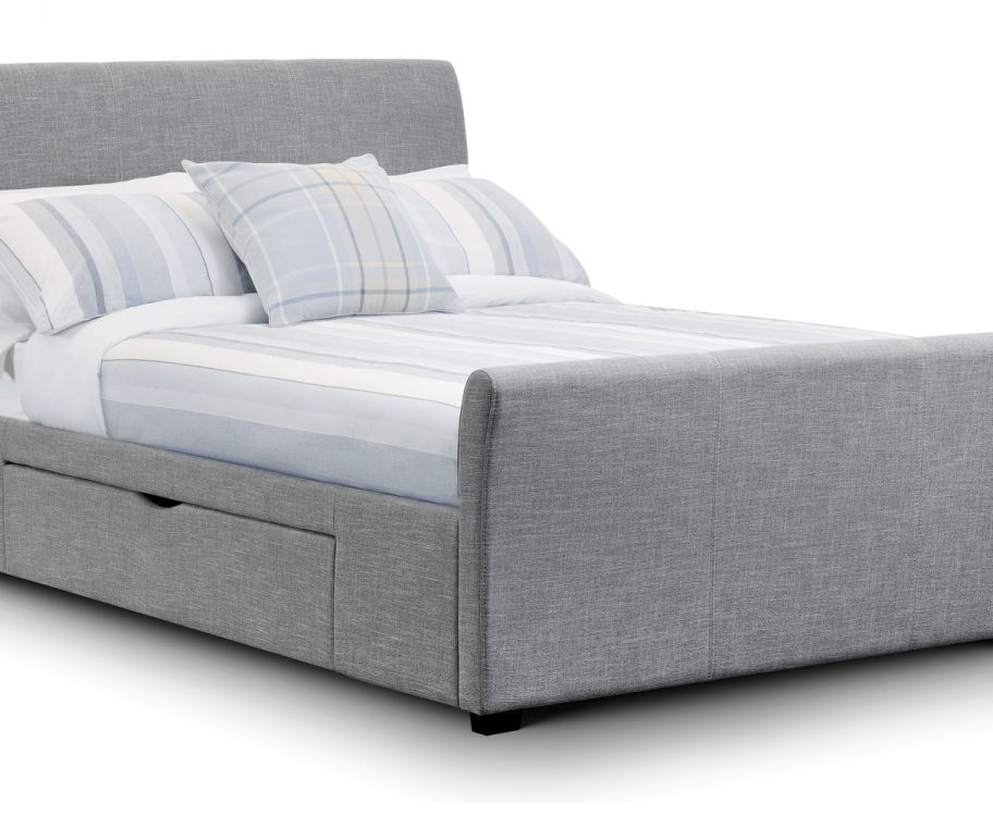 Our Capri Bed is a contemporary curved design fabric bed with two large storage drawers and finished in soft light grey linen style fabric . It offers the perfect combination of style and functionality and fits beautifully with all décor styles.